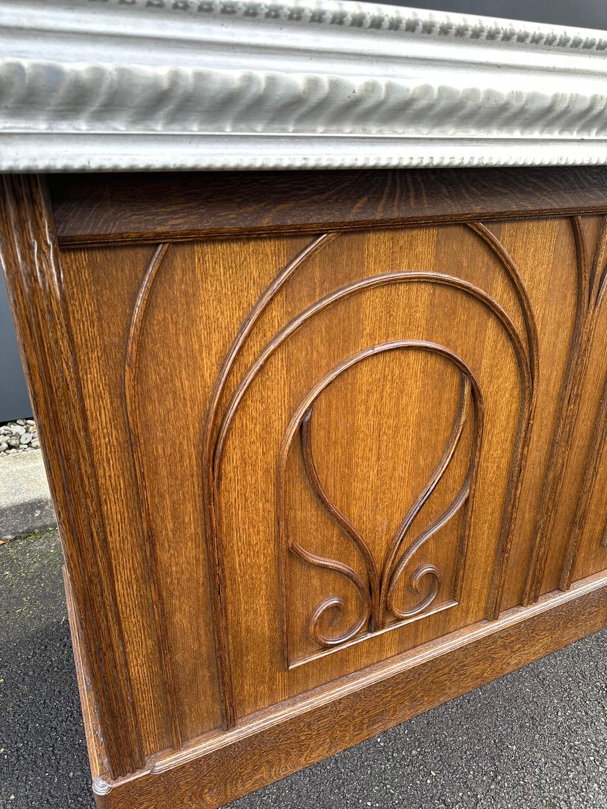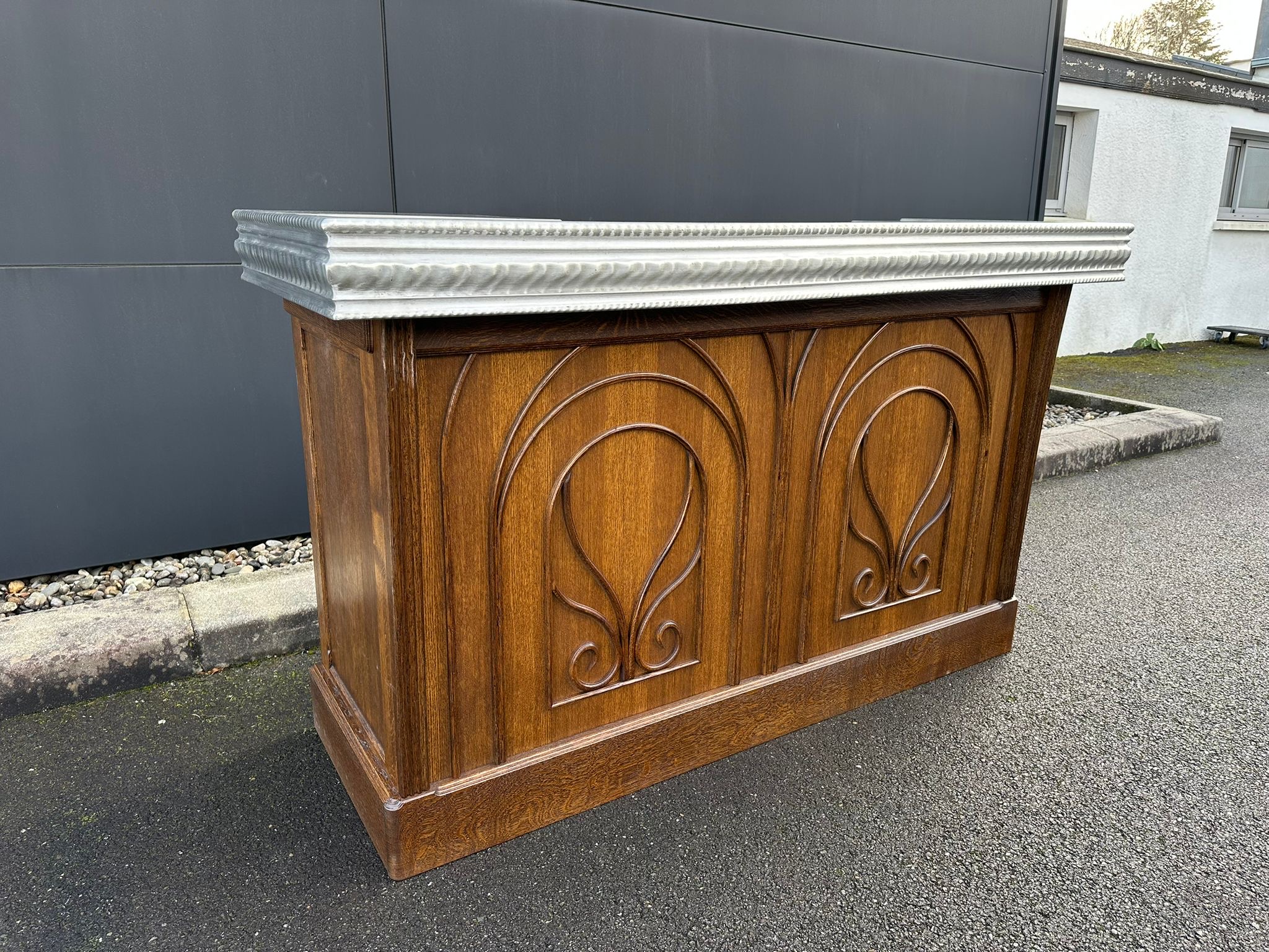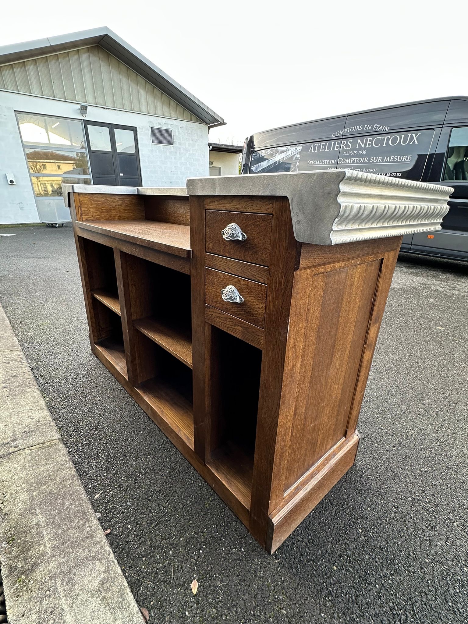 New 1900s-style counter in oak and oak slats.Turned wood motifs. Two drawers with period handles. Recut and restored Pewter countertop from the 1990s which had been originally handcrafted for the Bistrot « Le Bouquet Wagram" in Paris's 17th arrondissement.