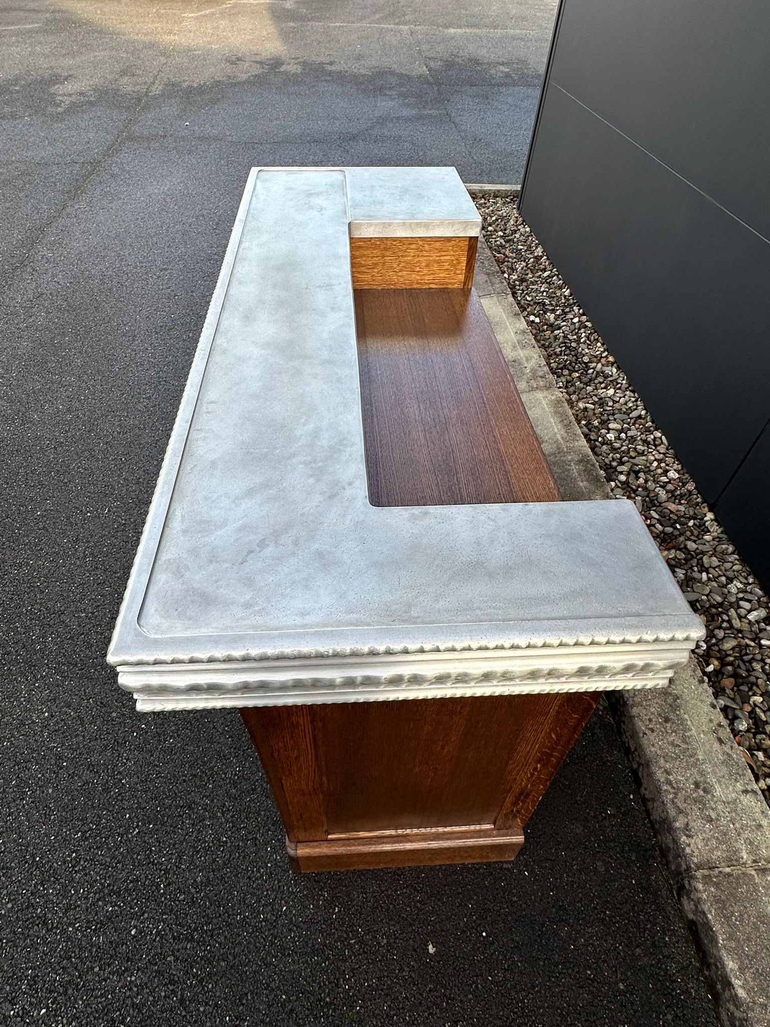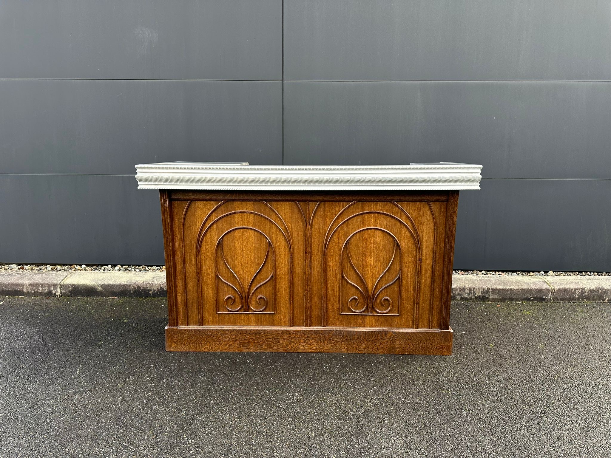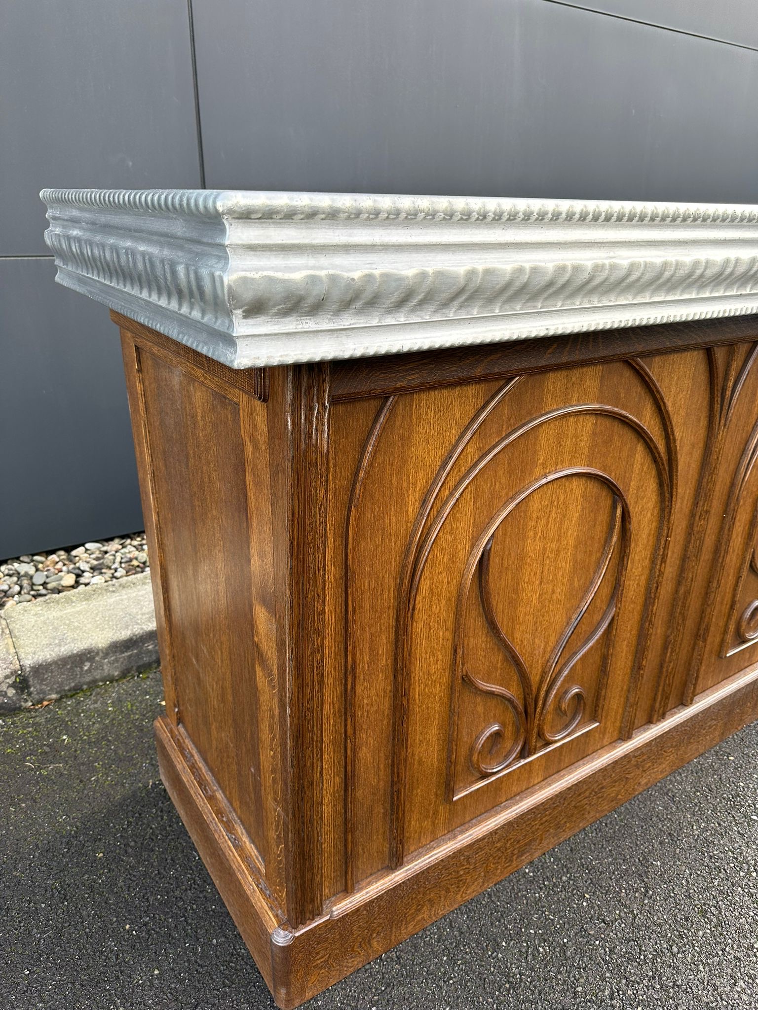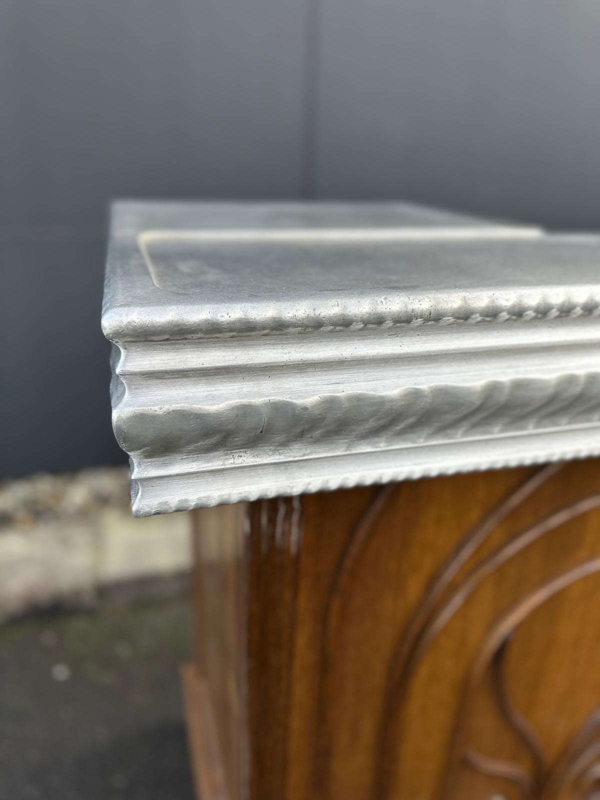 New 1900s-style counter in oak and oak slats.Turned wood motifs. Two drawers with period handles. Recut and restored Pewter countertop from the 1990s which had been originally handcrafted for the Bistrot « Le Bouquet Wagram" in Paris's 17th arrondissement.