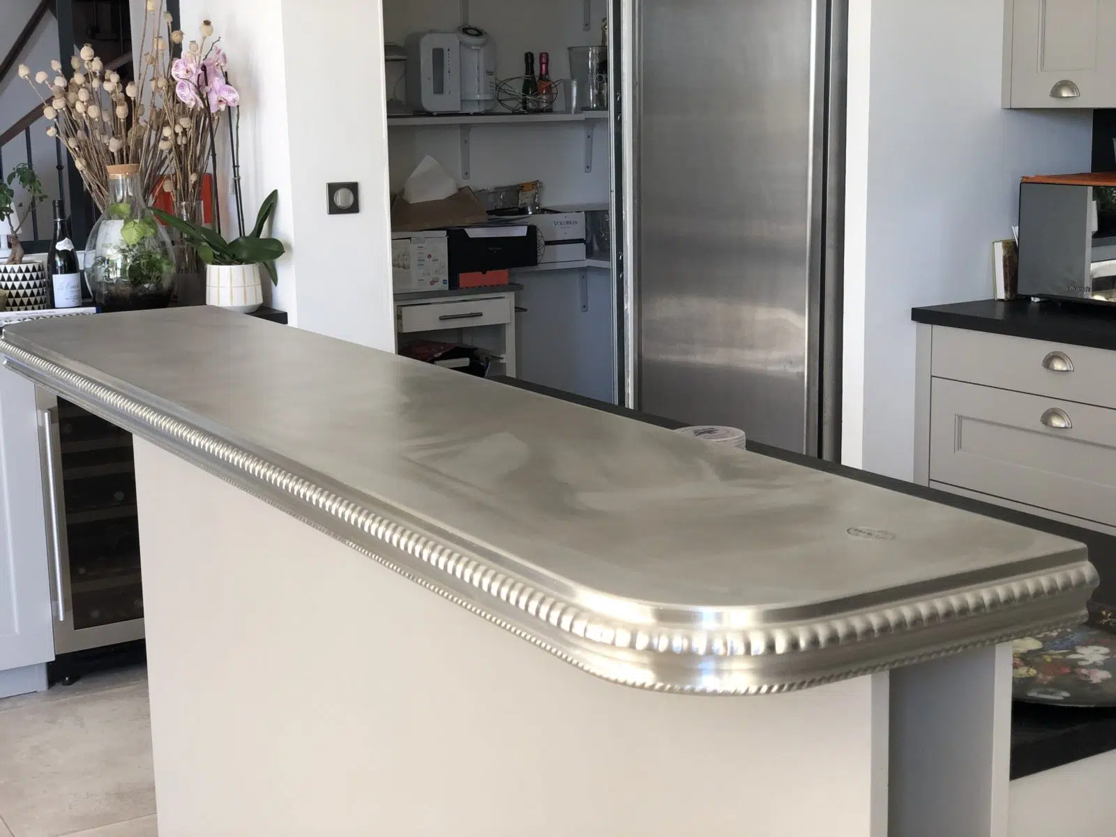 Cette Bordure, la petite sœur de la N°18; c’est l’épanouissement de l’Art Déco ! Plus courte de 1,5cm, elle n’a rien à lui envier. C’est incroyable ce que ses petits diamants de cabochons meublent un espace, font ressortir ses lignes et les courbes d’un comptoir. On dit qu’une piste en étain illumine une pièce et attire l’œil. L’Art Déco c’est aussi des jeux de lumières ; l’avènement des néons cherche à faire ressortir les différents éléments d’un lieu.