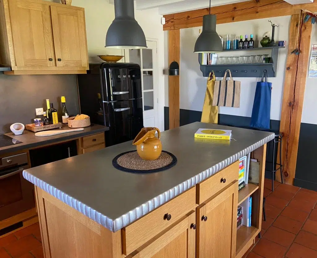 Les tables en étain sont le prolongement naturel d’un comptoir. Au « Père Claude », l’ancien repère du Président Jacques Chirac, les clients se pressent du monde entier pour prendre un verre sur un très beau comptoir, et réservent longtemps à l’avance pour déjeuner ou dîner sur un mange-debout ou la table d’hôtes en étain (Bordure Table N° 6 ; 5cm).