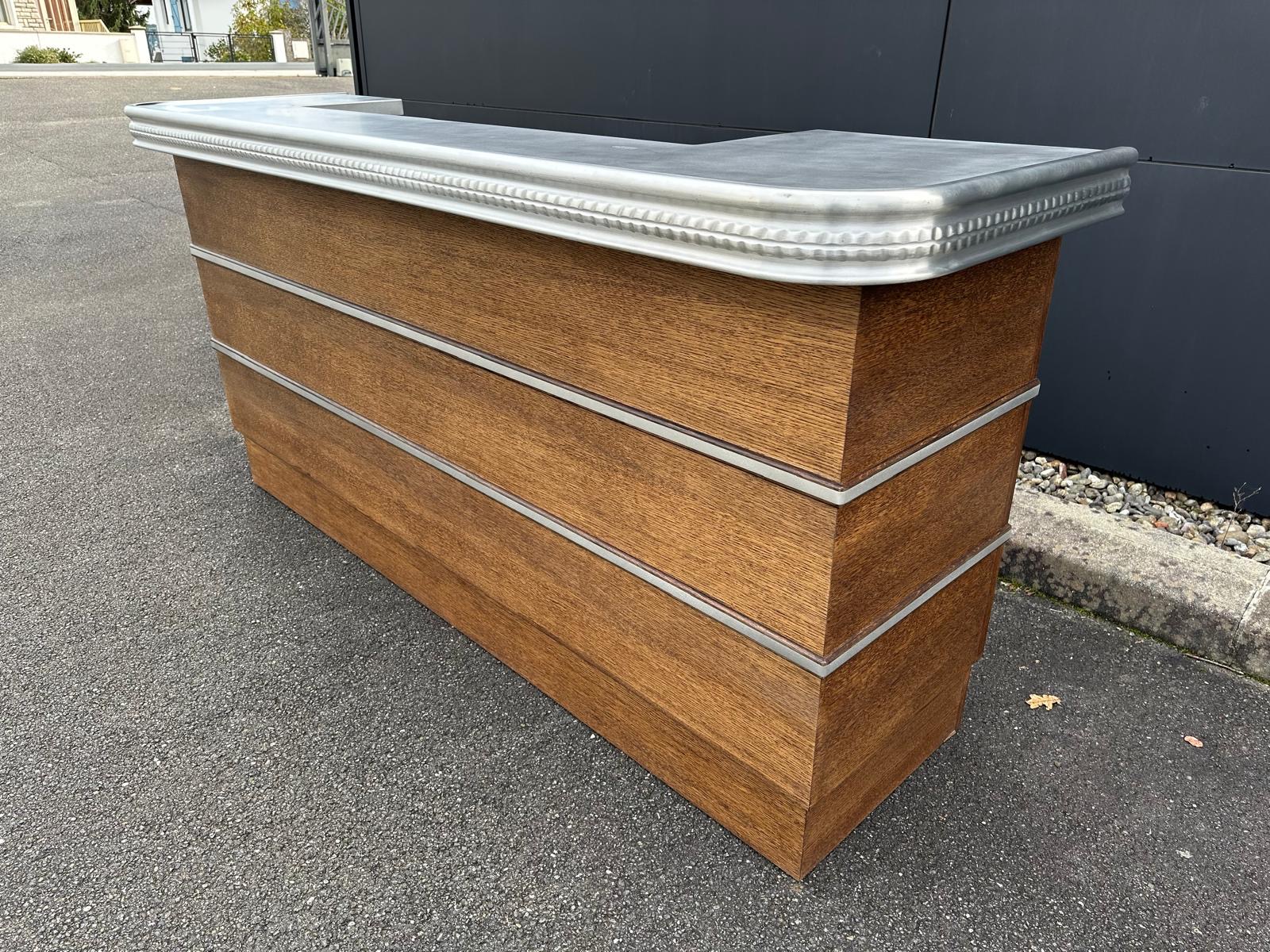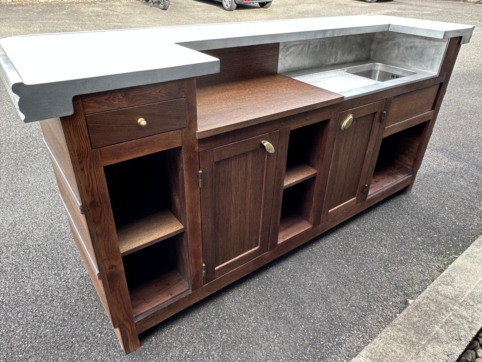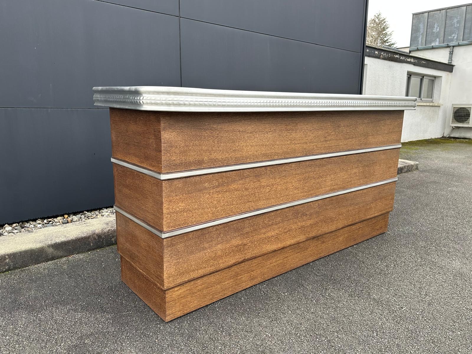 Comptoir provenant des Etablissements Martin-Meallet – Les Comptoirs de Paris et datant des années 1960 entièrement restauré. Façade en placage chêne et chêne massif. Intérieur de plusieurs essences (chêne, hêtre, pin). Intérieur en étain d’époque (cannelé refait à neuf). Cuve remplacée par une cuve neuve en inox brossé. Possibilité de mise en eau facile.  Poignées en laiton d’époque.