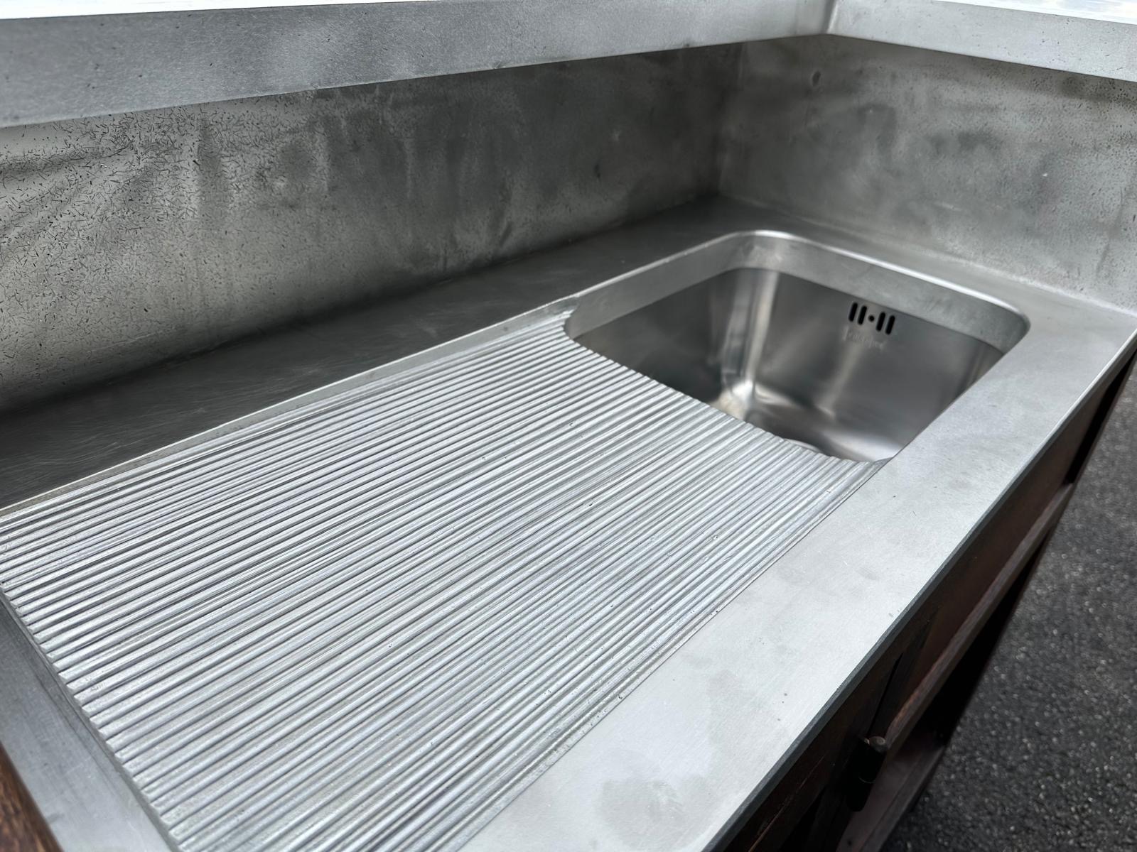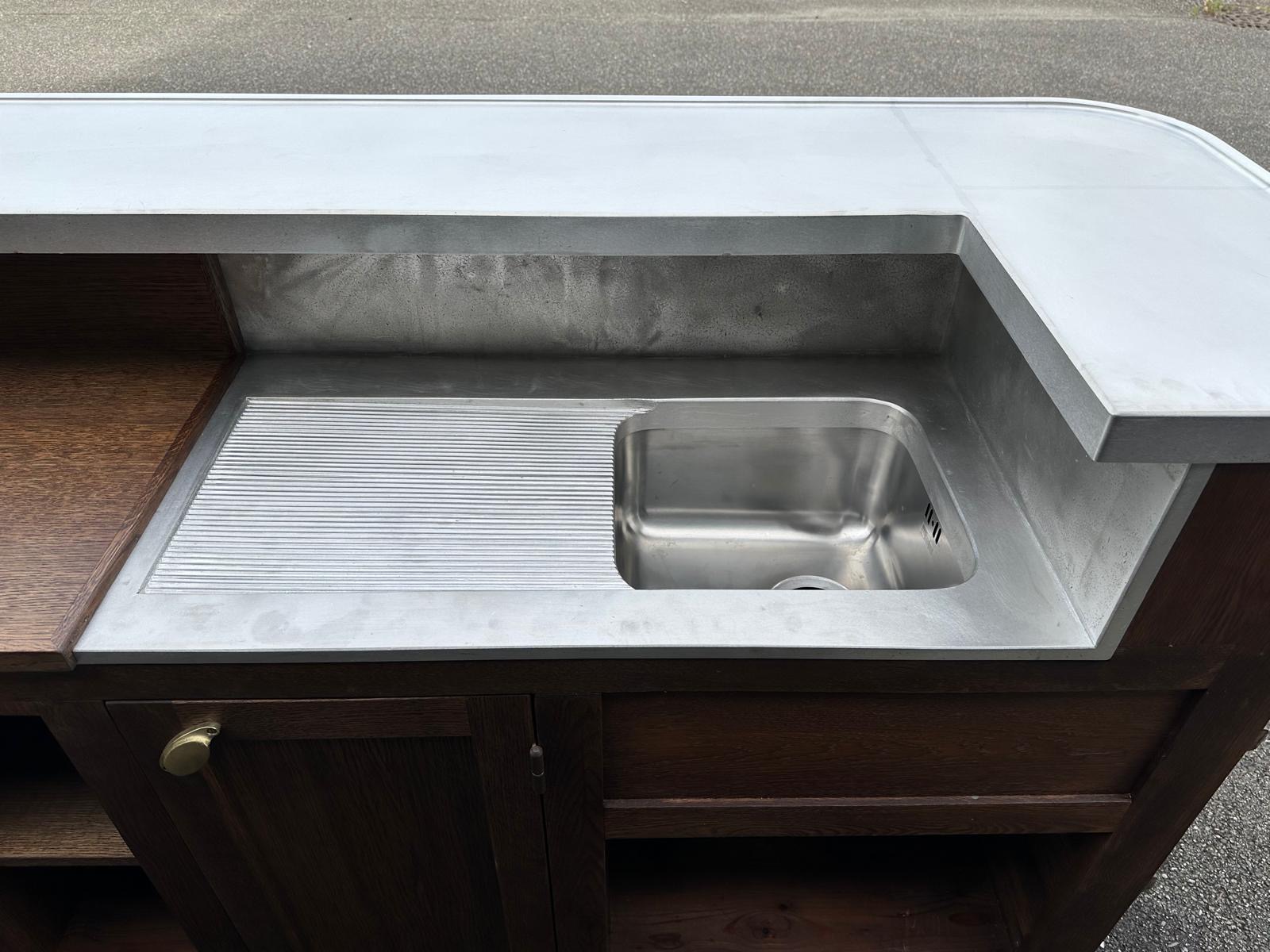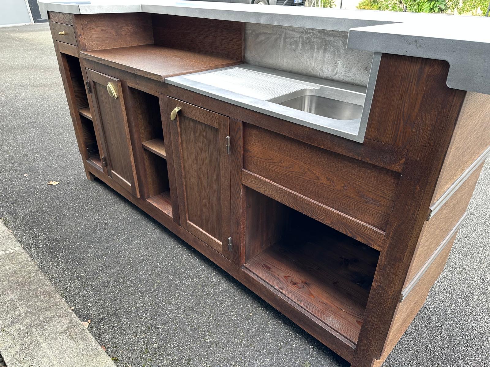 Comptoir provenant des Etablissements Martin-Meallet – Les Comptoirs de Paris et datant des années 1960 entièrement restauré. Façade en placage chêne et chêne massif. Intérieur de plusieurs essences (chêne, hêtre, pin). Intérieur en étain d’époque (cannelé refait à neuf). Cuve remplacée par une cuve neuve en inox brossé. Possibilité de mise en eau facile.  Poignées en laiton d’époque.