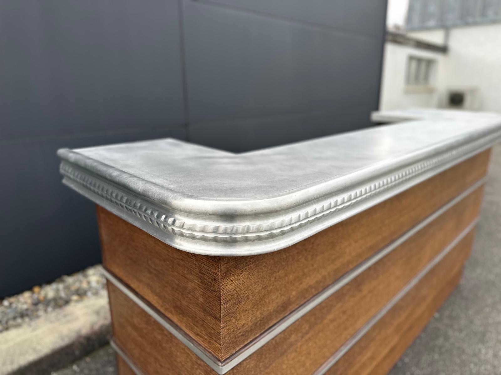 Dessus de Comptoir en étain provenant de nos Ateliers, restauré tout en maintenant sa patine acquise depuis son origine. Bordure N° 22 (10cm) avec relevage moderne de 5mm. Largeur de piste de 34 cm avec plateau sur un côté.