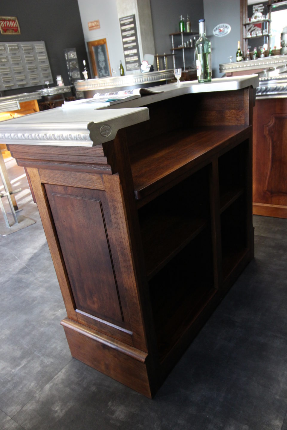 Comptoir en chêne massif et acajou avec une marqueterie en façade style 1930 restauré. Dessus en étain alimentaire avec bordure N°16 (6.5 CM) sur un relevage de 5 mm de haut. L’intérieur est aménagé en espace de rangement sous un plan de travail.