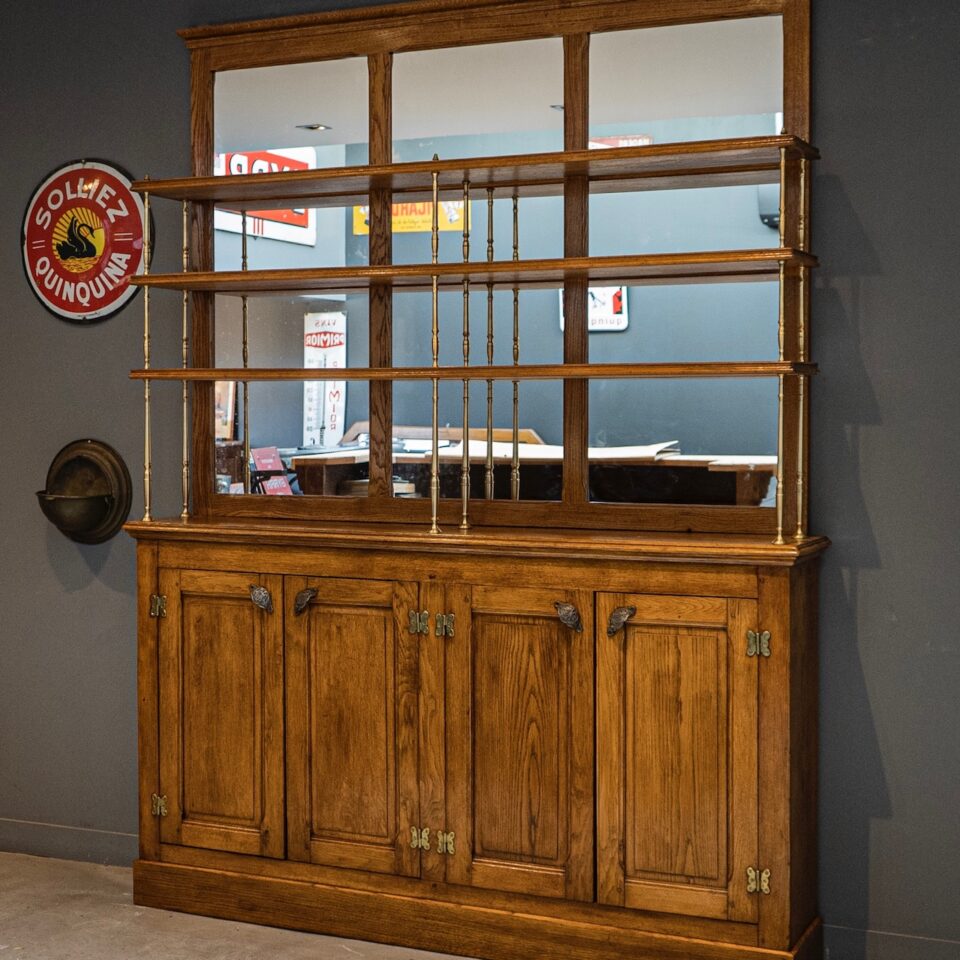 Meuble d’arrière comptoir datant du début du 20e siècle en chêne massif entièrement restauré.